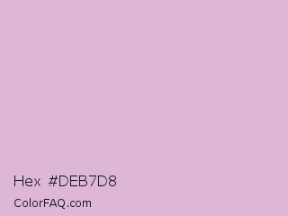 Hex #deb7d8 Color is a light magenta color and the nearest color is Thistle #d8bfd8. Hex code #deb7d8 and RGB value is rgb(222,183,216). In RGB color space, this color is composed of 87% red, 72% green, 85% blue, In CMYK color space, this color is composed of 0% cyan, 18% magenta, 3% yellow , 13% black , In HSL color space, this color has a hue angle of 309° , 37% saturation and 79% lightness.