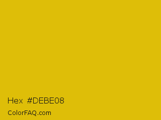 Hex #debe08 Color is a normal yellow color and the nearest color is Corn #e7bf05. Hex code #debe08 and RGB value is rgb(222,190,8). In RGB color space, this color is composed of 87% red, 75% green, 3% blue, In CMYK color space, this color is composed of 0% cyan, 14% magenta, 96% yellow , 13% black , In HSL color space, this color has a hue angle of 51° , 93% saturation and 45% lightness.