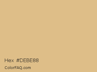 Hex #debe88 Color is a light orange color and the nearest color is Burlywood #deb887. Hex code #debe88 and RGB value is rgb(222,190,136). In RGB color space, this color is composed of 87% red, 75% green, 53% blue, In CMYK color space, this color is composed of 0% cyan, 14% magenta, 39% yellow , 13% black , In HSL color space, this color has a hue angle of 38° , 57% saturation and 70% lightness.