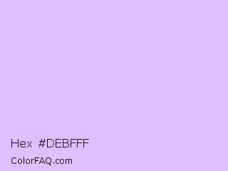 Hex #debfff Color is a very light violet color and the nearest color is Mauve #e0b0ff. Hex code #debfff and RGB value is rgb(222,191,255). In RGB color space, this color is composed of 87% red, 75% green, 100% blue, In CMYK color space, this color is composed of 13% cyan, 25% magenta, 0% yellow , 0% black , In HSL color space, this color has a hue angle of 269° , 100% saturation and 87% lightness.