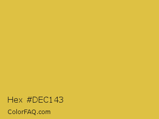 Hex #dec143 Color is a normal yellow color and the nearest color is Anzac #e0b646. Hex code #dec143 and RGB value is rgb(222,193,67). In RGB color space, this color is composed of 87% red, 76% green, 26% blue, In CMYK color space, this color is composed of 0% cyan, 13% magenta, 70% yellow , 13% black , In HSL color space, this color has a hue angle of 49° , 70% saturation and 57% lightness.