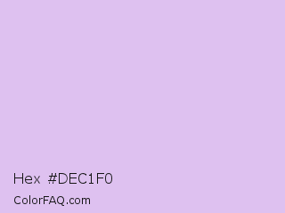 Hex #dec1f0 Color is a very light purple color and the nearest color is French Lilac #ecc7ee. Hex code #dec1f0 and RGB value is rgb(222,193,240). In RGB color space, this color is composed of 87% red, 76% green, 94% blue, In CMYK color space, this color is composed of 8% cyan, 20% magenta, 0% yellow , 6% black , In HSL color space, this color has a hue angle of 277° , 61% saturation and 85% lightness.