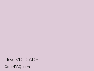 Hex #decad8 Color is a very light magenta color and the nearest color is Lola #dfcfdb. Hex code #decad8 and RGB value is rgb(222,202,216). In RGB color space, this color is composed of 87% red, 79% green, 85% blue, In CMYK color space, this color is composed of 0% cyan, 9% magenta, 3% yellow , 13% black , In HSL color space, this color has a hue angle of 318° , 23% saturation and 83% lightness.