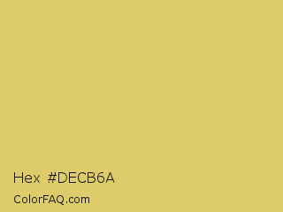 Hex #decb6a Color is a light yellow color and the nearest color is Chenin #dfcd6f. Hex code #decb6a and RGB value is rgb(222,203,106). In RGB color space, this color is composed of 87% red, 80% green, 42% blue, In CMYK color space, this color is composed of 0% cyan, 9% magenta, 52% yellow , 13% black , In HSL color space, this color has a hue angle of 50° , 64% saturation and 64% lightness.