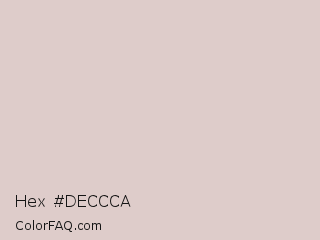 Hex #deccca Color is a very light red color and the nearest color is Wafer #decbc6. Hex code #deccca and RGB value is rgb(222,204,202). In RGB color space, this color is composed of 87% red, 80% green, 79% blue, In CMYK color space, this color is composed of 0% cyan, 8% magenta, 9% yellow , 13% black , In HSL color space, this color has a hue angle of 6° , 23% saturation and 83% lightness.