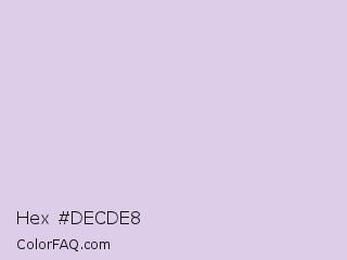 Hex #decde8 Color is a very light purple color and the nearest color is Twilight #e4cfde. Hex code #decde8 and RGB value is rgb(222,205,232). In RGB color space, this color is composed of 87% red, 80% green, 91% blue, In CMYK color space, this color is composed of 4% cyan, 12% magenta, 0% yellow , 9% black , In HSL color space, this color has a hue angle of 278° , 37% saturation and 86% lightness.
