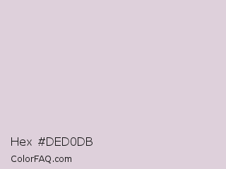 Hex #ded0db Color is a very light magenta color and the nearest color is Lola #dfcfdb. Hex code #ded0db and RGB value is rgb(222,208,219). In RGB color space, this color is composed of 87% red, 82% green, 86% blue, In CMYK color space, this color is composed of 0% cyan, 6% magenta, 1% yellow , 13% black , In HSL color space, this color has a hue angle of 313° , 18% saturation and 84% lightness.