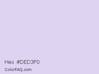 Hex #ded3f0 Color is a very light violet color and the nearest color is Snuff #e2d8ed. Hex code #ded3f0 and RGB value is rgb(222,211,240). In RGB color space, this color is composed of 87% red, 83% green, 94% blue, In CMYK color space, this color is composed of 8% cyan, 12% magenta, 0% yellow , 6% black , In HSL color space, this color has a hue angle of 263° , 49% saturation and 88% lightness.
