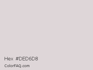 Hex #ded6d8 Color is a very light red color and the nearest color is Swiss Coffee #ddd6d5. Hex code #ded6d8 and RGB value is rgb(222,214,216). In RGB color space, this color is composed of 87% red, 84% green, 85% blue, In CMYK color space, this color is composed of 0% cyan, 4% magenta, 3% yellow , 13% black , In HSL color space, this color has a hue angle of 345° , 11% saturation and 85% lightness.