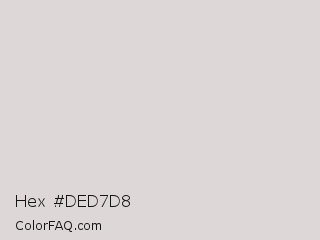 Hex #ded7d8 Color is a very light red color and the nearest color is Swiss Coffee #ddd6d5. Hex code #ded7d8 and RGB value is rgb(222,215,216). In RGB color space, this color is composed of 87% red, 84% green, 85% blue, In CMYK color space, this color is composed of 0% cyan, 3% magenta, 3% yellow , 13% black , In HSL color space, this color has a hue angle of 351° , 10% saturation and 86% lightness.