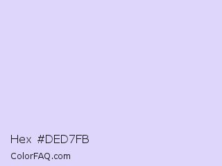 Hex #ded7fb Color is a very light indigo color and the nearest color is Pale Lavender #dcd0ff. Hex code #ded7fb and RGB value is rgb(222,215,251). In RGB color space, this color is composed of 87% red, 84% green, 98% blue, In CMYK color space, this color is composed of 12% cyan, 14% magenta, 0% yellow , 2% black , In HSL color space, this color has a hue angle of 252° , 82% saturation and 91% lightness.