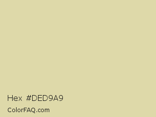 Hex #ded9a9 Color is a light yellow color and the nearest color is Sapling #ded4a4. Hex code #ded9a9 and RGB value is rgb(222,217,169). In RGB color space, this color is composed of 87% red, 85% green, 66% blue, In CMYK color space, this color is composed of 0% cyan, 2% magenta, 24% yellow , 13% black , In HSL color space, this color has a hue angle of 54° , 45% saturation and 77% lightness.