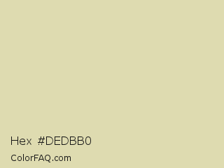 Hex #dedbb0 Color is a light yellow color and the nearest color is Hampton #e5d8af. Hex code #dedbb0 and RGB value is rgb(222,219,176). In RGB color space, this color is composed of 87% red, 86% green, 69% blue, In CMYK color space, this color is composed of 0% cyan, 1% magenta, 21% yellow , 13% black , In HSL color space, this color has a hue angle of 56° , 41% saturation and 78% lightness.