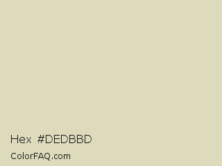 Hex #dedbbd Color is a very light yellow color and the nearest color is Tana #d9dcc1. Hex code #dedbbd and RGB value is rgb(222,219,189). In RGB color space, this color is composed of 87% red, 86% green, 74% blue, In CMYK color space, this color is composed of 0% cyan, 1% magenta, 15% yellow , 13% black , In HSL color space, this color has a hue angle of 55° , 33% saturation and 81% lightness.