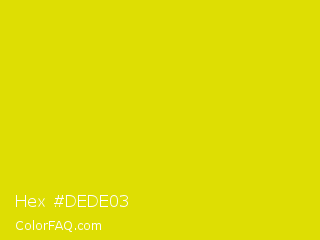 Hex #dede03 Color is a normal yellow color and the nearest color is Peridot #e6e200. Hex code #dede03 and RGB value is rgb(222,222,3). In RGB color space, this color is composed of 87% red, 87% green, 1% blue, In CMYK color space, this color is composed of 0% cyan, 0% magenta, 99% yellow , 13% black , In HSL color space, this color has a hue angle of 60° , 97% saturation and 44% lightness.