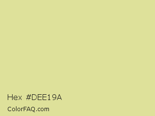 Hex #dee19a Color is a light yellow color and the nearest color is Zombie #e4d69b. Hex code #dee19a and RGB value is rgb(222,225,154). In RGB color space, this color is composed of 87% red, 88% green, 60% blue, In CMYK color space, this color is composed of 1% cyan, 0% magenta, 32% yellow , 12% black , In HSL color space, this color has a hue angle of 63° , 54% saturation and 74% lightness.