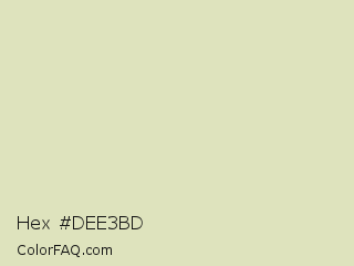 Hex #dee3bd Color is a very light yellow color and the nearest color is Beryl Green #dee5c0. Hex code #dee3bd and RGB value is rgb(222,227,189). In RGB color space, this color is composed of 87% red, 89% green, 74% blue, In CMYK color space, this color is composed of 2% cyan, 0% magenta, 17% yellow , 11% black , In HSL color space, this color has a hue angle of 68° , 40% saturation and 82% lightness.