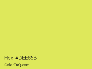 Hex #dee85b Color is a light yellow color and the nearest color is Maximum Green Yellow #d9e650. Hex code #dee85b and RGB value is rgb(222,232,91). In RGB color space, this color is composed of 87% red, 91% green, 36% blue, In CMYK color space, this color is composed of 4% cyan, 0% magenta, 61% yellow , 9% black , In HSL color space, this color has a hue angle of 64° , 75% saturation and 63% lightness.