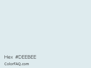Hex #deebee Color is a very light cyan color and the nearest color is Mystic #e2ebed. Hex code #deebee and RGB value is rgb(222,235,238). In RGB color space, this color is composed of 87% red, 92% green, 93% blue, In CMYK color space, this color is composed of 7% cyan, 1% magenta, 0% yellow , 7% black , In HSL color space, this color has a hue angle of 191° , 32% saturation and 90% lightness.