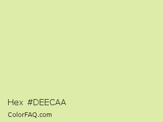 Hex #deecaa Color is a light lime color and the nearest color is Caper #dcedb4. Hex code #deecaa and RGB value is rgb(222,236,170). In RGB color space, this color is composed of 87% red, 93% green, 67% blue, In CMYK color space, this color is composed of 6% cyan, 0% magenta, 28% yellow , 7% black , In HSL color space, this color has a hue angle of 73° , 63% saturation and 80% lightness.