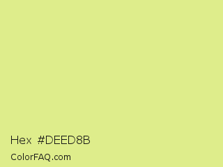 Hex #deed8b Color is a light yellow color and the nearest color is Key Lime #e8f48c. Hex code #deed8b and RGB value is rgb(222,237,139). In RGB color space, this color is composed of 87% red, 93% green, 55% blue, In CMYK color space, this color is composed of 6% cyan, 0% magenta, 41% yellow , 7% black , In HSL color space, this color has a hue angle of 69° , 73% saturation and 74% lightness.