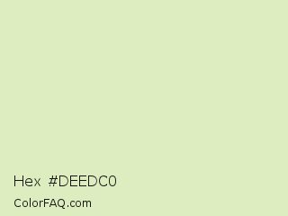 Hex #deedc0 Color is a very light green color and the nearest color is Beryl Green #dee5c0. Hex code #deedc0 and RGB value is rgb(222,237,192). In RGB color space, this color is composed of 87% red, 93% green, 75% blue, In CMYK color space, this color is composed of 6% cyan, 0% magenta, 19% yellow , 7% black , In HSL color space, this color has a hue angle of 80° , 56% saturation and 84% lightness.