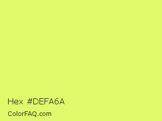 Hex #defa6a Color is a light lime color and the nearest color is Canary #f3fb62. Hex code #defa6a and RGB value is rgb(222,250,106). In RGB color space, this color is composed of 87% red, 98% green, 42% blue, In CMYK color space, this color is composed of 11% cyan, 0% magenta, 58% yellow , 2% black , In HSL color space, this color has a hue angle of 72° , 94% saturation and 70% lightness.