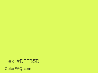 Hex #defb5d Color is a light lime color and the nearest color is Canary #f3fb62. Hex code #defb5d and RGB value is rgb(222,251,93). In RGB color space, this color is composed of 87% red, 98% green, 36% blue, In CMYK color space, this color is composed of 12% cyan, 0% magenta, 63% yellow , 2% black , In HSL color space, this color has a hue angle of 71° , 95% saturation and 67% lightness.