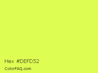Hex #defd52 Color is a light lime color and the nearest color is Starship #ecf245. Hex code #defd52 and RGB value is rgb(222,253,82). In RGB color space, this color is composed of 87% red, 99% green, 32% blue, In CMYK color space, this color is composed of 12% cyan, 0% magenta, 68% yellow , 1% black , In HSL color space, this color has a hue angle of 71° , 98% saturation and 66% lightness.