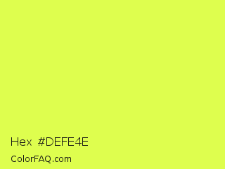 Hex #defe4e Color is a light lime color and the nearest color is Starship #ecf245. Hex code #defe4e and RGB value is rgb(222,254,78). In RGB color space, this color is composed of 87% red, 100% green, 31% blue, In CMYK color space, this color is composed of 13% cyan, 0% magenta, 69% yellow , 0% black , In HSL color space, this color has a hue angle of 71° , 99% saturation and 65% lightness.
