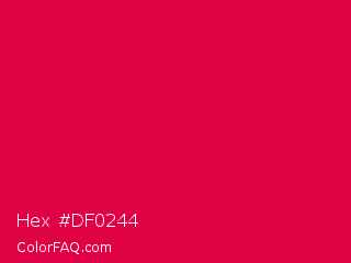 Hex #df0244 Color is a normal rose color and the nearest color is Rich Carmine #d70040. Hex code #df0244 and RGB value is rgb(223,2,68). In RGB color space, this color is composed of 87% red, 1% green, 27% blue, In CMYK color space, this color is composed of 0% cyan, 99% magenta, 70% yellow , 13% black , In HSL color space, this color has a hue angle of 342° , 98% saturation and 44% lightness.