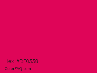 Hex #df0558 Color is a normal rose color and the nearest color is Razzmatazz Crayola #e30b5c. Hex code #df0558 and RGB value is rgb(223,5,88). In RGB color space, this color is composed of 87% red, 2% green, 35% blue, In CMYK color space, this color is composed of 0% cyan, 98% magenta, 61% yellow , 13% black , In HSL color space, this color has a hue angle of 337° , 96% saturation and 45% lightness.