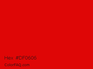 Hex #df0606 Color is a normal red color and the nearest color is KU Crimson #e8000d. Hex code #df0606 and RGB value is rgb(223,6,6). In RGB color space, this color is composed of 87% red, 2% green, 2% blue, In CMYK color space, this color is composed of 0% cyan, 97% magenta, 97% yellow , 13% black , In HSL color space, this color has a hue angle of 0° , 95% saturation and 45% lightness.