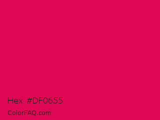 Hex #df0655 Color is a normal rose color and the nearest color is Debian Red #d70a53. Hex code #df0655 and RGB value is rgb(223,6,85). In RGB color space, this color is composed of 87% red, 2% green, 33% blue, In CMYK color space, this color is composed of 0% cyan, 97% magenta, 62% yellow , 13% black , In HSL color space, this color has a hue angle of 338° , 95% saturation and 45% lightness.