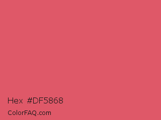 Hex #df5868 Color is a light red color and the nearest color is Mandy #e25465. Hex code #df5868 and RGB value is rgb(223,88,104). In RGB color space, this color is composed of 87% red, 35% green, 41% blue, In CMYK color space, this color is composed of 0% cyan, 61% magenta, 53% yellow , 13% black , In HSL color space, this color has a hue angle of 353° , 68% saturation and 61% lightness.