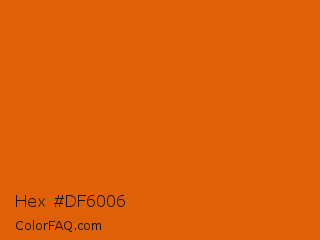 Hex #df6006 Color is a normal orange color and the nearest color is Bamboo #da6304. Hex code #df6006 and RGB value is rgb(223,96,6). In RGB color space, this color is composed of 87% red, 38% green, 2% blue, In CMYK color space, this color is composed of 0% cyan, 57% magenta, 97% yellow , 13% black , In HSL color space, this color has a hue angle of 25° , 95% saturation and 45% lightness.