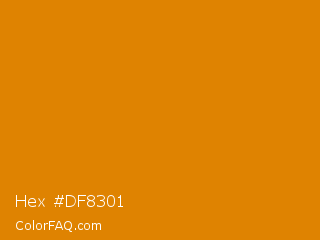 Hex #df8301 Color is a normal orange color and the nearest color is Fulvous #e48400. Hex code #df8301 and RGB value is rgb(223,131,1). In RGB color space, this color is composed of 87% red, 51% green, 0% blue, In CMYK color space, this color is composed of 0% cyan, 41% magenta, 100% yellow , 13% black , In HSL color space, this color has a hue angle of 35° , 99% saturation and 44% lightness.