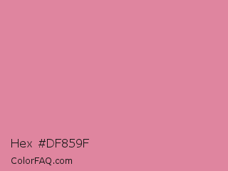 Hex #df859f Color is a light rose color and the nearest color is Shimmering Blush #d98695. Hex code #df859f and RGB value is rgb(223,133,159). In RGB color space, this color is composed of 87% red, 52% green, 62% blue, In CMYK color space, this color is composed of 0% cyan, 40% magenta, 29% yellow , 13% black , In HSL color space, this color has a hue angle of 343° , 58% saturation and 70% lightness.