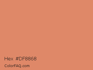 Hex #df8868 Color is a light orange color and the nearest color is Copperfield #da8a67. Hex code #df8868 and RGB value is rgb(223,136,104). In RGB color space, this color is composed of 87% red, 53% green, 41% blue, In CMYK color space, this color is composed of 0% cyan, 39% magenta, 53% yellow , 13% black , In HSL color space, this color has a hue angle of 16° , 65% saturation and 64% lightness.