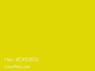 Hex #dfd803 Color is a normal yellow color and the nearest color is Citrine #e4d00a. Hex code #dfd803 and RGB value is rgb(223,216,3). In RGB color space, this color is composed of 87% red, 85% green, 1% blue, In CMYK color space, this color is composed of 0% cyan, 3% magenta, 99% yellow , 13% black , In HSL color space, this color has a hue angle of 58° , 97% saturation and 44% lightness.