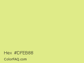 Hex #dfeb88 Color is a light yellow color and the nearest color is Key Lime #e8f48c. Hex code #dfeb88 and RGB value is rgb(223,235,136). In RGB color space, this color is composed of 87% red, 92% green, 53% blue, In CMYK color space, this color is composed of 5% cyan, 0% magenta, 42% yellow , 8% black , In HSL color space, this color has a hue angle of 67° , 71% saturation and 73% lightness.