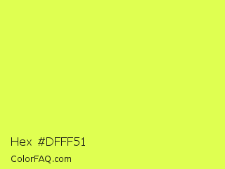 Hex #dfff51 Color is a light lime color and the nearest color is Starship #ecf245. Hex code #dfff51 and RGB value is rgb(223,255,81). In RGB color space, this color is composed of 87% red, 100% green, 32% blue, In CMYK color space, this color is composed of 13% cyan, 0% magenta, 68% yellow , 0% black , In HSL color space, this color has a hue angle of 71° , 100% saturation and 66% lightness.