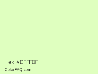 Hex #dfffbf Color is a very light green color and the nearest color is Snow Flurry #e4ffd1. Hex code #dfffbf and RGB value is rgb(223,255,191). In RGB color space, this color is composed of 87% red, 100% green, 75% blue, In CMYK color space, this color is composed of 13% cyan, 0% magenta, 25% yellow , 0% black , In HSL color space, this color has a hue angle of 90° , 100% saturation and 87% lightness.