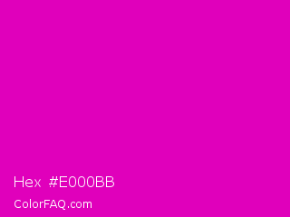 Hex #e000bb Color is a normal magenta color and the nearest color is Deep Magenta #cc00cc. Hex code #e000bb and RGB value is rgb(224,0,187). In RGB color space, this color is composed of 88% red, 0% green, 73% blue, In CMYK color space, this color is composed of 0% cyan, 100% magenta, 17% yellow , 12% black , In HSL color space, this color has a hue angle of 310° , 100% saturation and 44% lightness.
