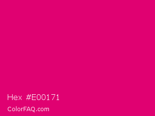 Hex #e00171 Color is a normal rose color and the nearest color is Red Purple #e40078. Hex code #e00171 and RGB value is rgb(224,1,113). In RGB color space, this color is composed of 88% red, 0% green, 44% blue, In CMYK color space, this color is composed of 0% cyan, 100% magenta, 50% yellow , 12% black , In HSL color space, this color has a hue angle of 330° , 99% saturation and 44% lightness.