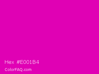 Hex #e001b4 Color is a normal magenta color and the nearest color is Hollywood Cerise #f400a1. Hex code #e001b4 and RGB value is rgb(224,1,180). In RGB color space, this color is composed of 88% red, 0% green, 71% blue, In CMYK color space, this color is composed of 0% cyan, 100% magenta, 20% yellow , 12% black , In HSL color space, this color has a hue angle of 312° , 99% saturation and 44% lightness.