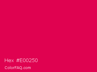 Hex #e00250 Color is a normal rose color and the nearest color is UA Red #d9004c. Hex code #e00250 and RGB value is rgb(224,2,80). In RGB color space, this color is composed of 88% red, 1% green, 31% blue, In CMYK color space, this color is composed of 0% cyan, 99% magenta, 64% yellow , 12% black , In HSL color space, this color has a hue angle of 339° , 98% saturation and 44% lightness.
