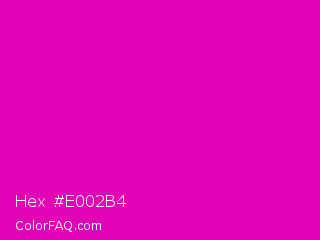 Hex #e002b4 Color is a normal magenta color and the nearest color is Hollywood Cerise #f400a1. Hex code #e002b4 and RGB value is rgb(224,2,180). In RGB color space, this color is composed of 88% red, 1% green, 71% blue, In CMYK color space, this color is composed of 0% cyan, 99% magenta, 20% yellow , 12% black , In HSL color space, this color has a hue angle of 312° , 98% saturation and 44% lightness.