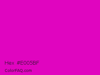 Hex #e005bf Color is a normal magenta color and the nearest color is Deep Magenta #cc00cc. Hex code #e005bf and RGB value is rgb(224,5,191). In RGB color space, this color is composed of 88% red, 2% green, 75% blue, In CMYK color space, this color is composed of 0% cyan, 98% magenta, 15% yellow , 12% black , In HSL color space, this color has a hue angle of 309° , 96% saturation and 45% lightness.