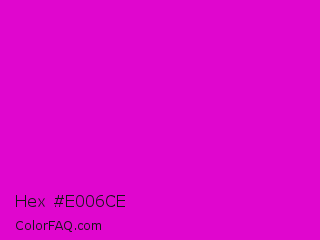 Hex #e006ce Color is a normal magenta color and the nearest color is Deep Magenta #cc00cc. Hex code #e006ce and RGB value is rgb(224,6,206). In RGB color space, this color is composed of 88% red, 2% green, 81% blue, In CMYK color space, this color is composed of 0% cyan, 97% magenta, 8% yellow , 12% black , In HSL color space, this color has a hue angle of 305° , 95% saturation and 45% lightness.